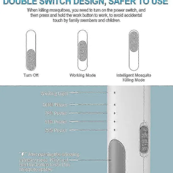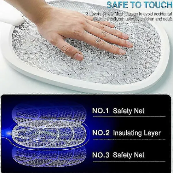 Säker: De övre och nedre lagren av den elektriska flugsmällan är säkerhetsnät som inte bara skyddar flugsmällan från skador, utan också förhindrar elektriska stötar under användning. I mitten finns en krypterad nätstruktur så att myggor inte kan fly med sina vingar. När den är avstängd kan restströmmen från gallret elimineras på 2 sekunder.