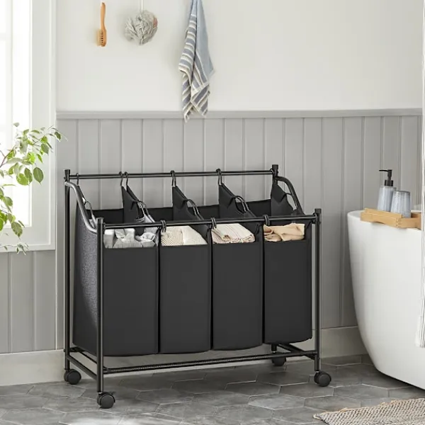 Tack vare de fyra hjulen, varav två är låsbara, kan tvättsorteraren enkelt flyttas mellan rum och säkert låsas på plats när det behövs. Dessutom fungerar ramens handtag som praktiska räcken för enkel hantering.