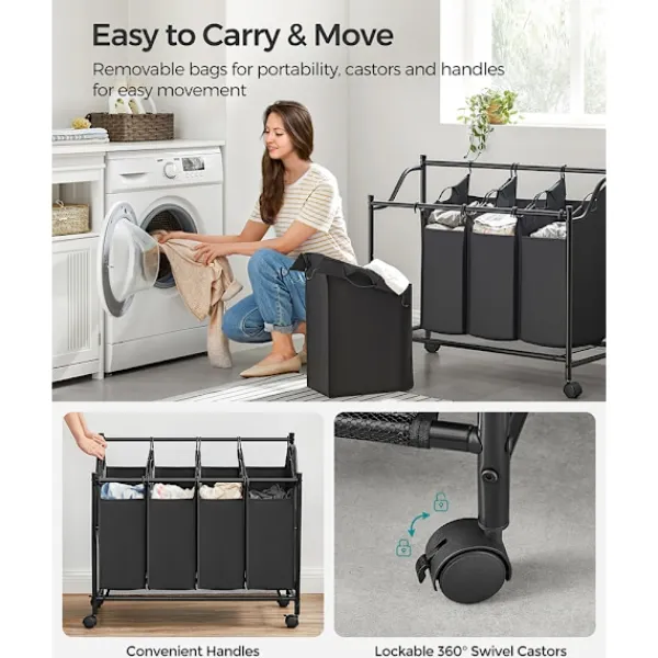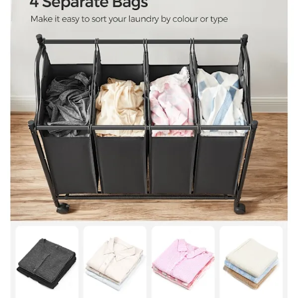De avtagbara påsarna, tillverkade av slitstarkt och vattenresistent 600D Oxford-tyg, är lätta att rengöra och kan enkelt bäras direkt till tvättmaskinen. Den robusta stålramen säkerställer stabilitet och hållbarhet, och tvättsorteraren klarar en total belastning på upp till 40 kg.