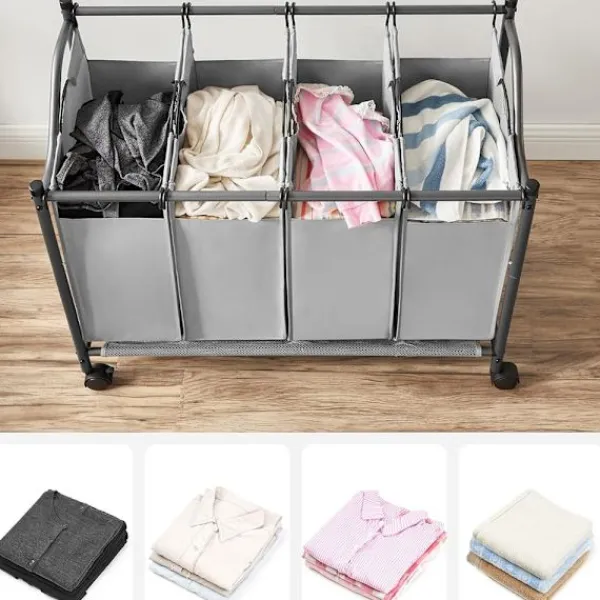 Håll tvätten organiserad med tvättkorgar på hjul med 4 avtagbara påsar – en praktisk och rymlig lösning för hemmet. Med en total kapacitet på 140 liter rymmer denna tvättsorterare stora mängder kläder och gör det enkelt att separera tvätten efter färg eller material.