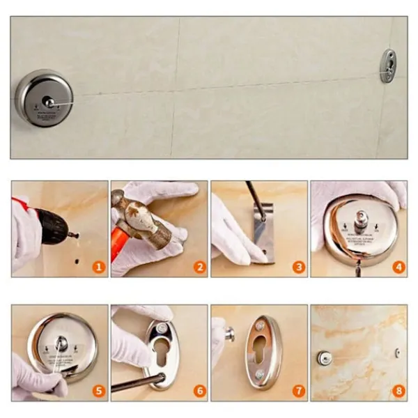 Hållbar infällbar klädstreck: Tillverkad av polerat rostfritt stål för hållbarhet. Stretchig design med infällbara trådar. Använd den när du behöver den och rulla ihop den snabbt när den inte används.
