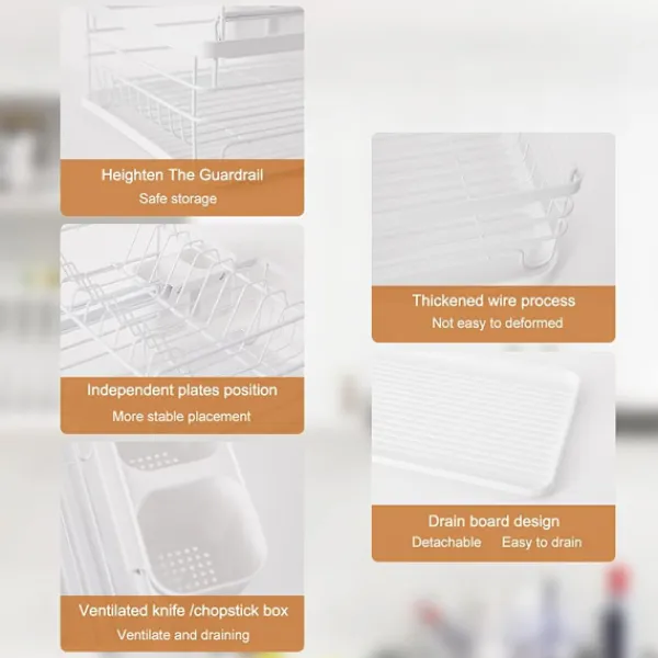 Med en avtagbar avrinningsbricka som kan samla upp vatten som droppar från disken, förhindrar du att din bänkskiva blir blöt. Hjälper också till att torka dina redskap och tallrikar enkelt och snabbt, håll din köksbänkskiva torr och ren.