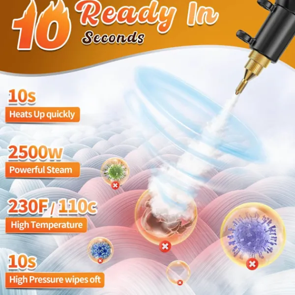 ✅ 【2500W Hög temperatur & Tryckångrengörare】 Ångrengörarens arbetseffekt är 2500W, den värms upp snabbt på 10 sekunder och når 221°F/105°C, vilket är superkraftfullt och enkelt och grundligt kan lossa och lösa upp smuts, skära fett,