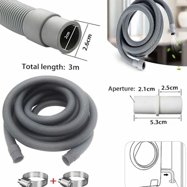 ??【Förlängd avloppsslangssats】Avloppsslangssatsen innehåller 3 m slang, 1 vit förlängningsadapter, 2 rostfria klämmor. Den passar även de flesta frontmatade tvättmaskiner.