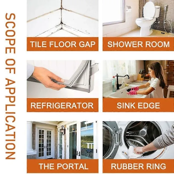 Gummiring i tvättmaskin, tätningslist i kylskåp, diskbänkskant, dörrar och fönster, fogar i kakelgolv, duschrum, kylskåp, diskbänkskant, gummiring och andra fogar i kakelgolv.