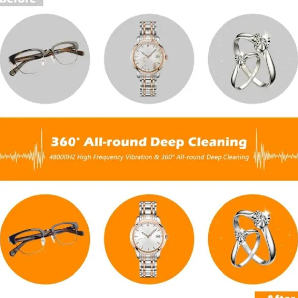 Kraftfull Rengöringsfunktion: Denna ultraljudstvätt kan generera 45 000 Hz ultraljudsvågor. Starka ultraljudsvågor kan skapa miljontals mikrobubblor. Den kan effektivt rengöra dina klockor, smycken och mer. Inga kemikalier eller rengöringsmedel behövs. Ge dina rena föremål ett nytt utseende.
