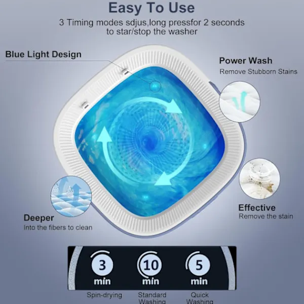 【Smarta Rengöringslägen】Med tre rengöringslägen – 3-minuters, 5-minuters och 10-minuters timerknappar – erbjuder vår mini-tvättmaskin flexibilitet för olika tvättbehov. Från snabb rengöring till djuprengöring, denna smarta rengöringsfunktion säkerställer att dina kläder rengörs noggrant varje gång.