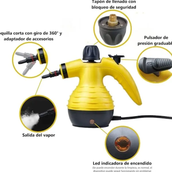 FUNKTIONER: Inkluderar 9 tillbehör för att underlätta uppgifter och användningsområden, med en genomsnittlig effekt på 3 bar och en temperatur på 135°C. Inget hörn kommer att lämnas utan ånga. Dess ergonomiska handtag gör den praktisk och enkel att använda. Tanken är på 250 ml.