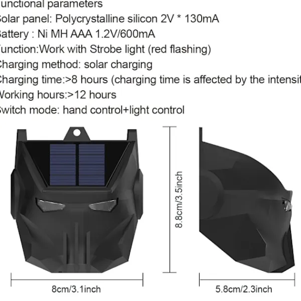 Denna djuravskräckare drivs av solenergi, vilket gör den till en miljövänlig och kostnadseffektiv lösning för skadedjursbekämpning. Den inbyggda solpanelen laddar Ni-MH AAA-batteriet under dagen och ger ström till de blinkande LED-lamporna för att fungera på natten. Detta eliminerar behovet av batterier eller elektriska sladdar, vilket gör den enkel att installera och underhålla. Solpanelen är tillverkad av polykristallint kisel med 2V x 130mA, vilket säkerställer effektiv laddning även i svagt ljus. Det uppladdningsbara batteriet säkerställer kontinuerlig drift och ger skydd mot skadedjur dygnet runt. Laddningstiden är >8 timmar, beroende på solljusets intensitet.