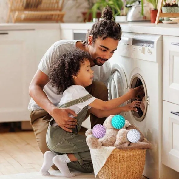 Våra återanvändbara torkbollar fungerar genom att lösa upp klumpar och mjuka upp tyget när de snurrar runt i torktumlaren. Detta ger bättre luftcirkulation och förhindrar att kläderna klumpar ihop sig, vilket resulterar i en jämnare torkning och färre veck. Dessutom kan de hjälpa till att reducera statisk elektricitet och minska behovet av kemiska torktumlarsark.