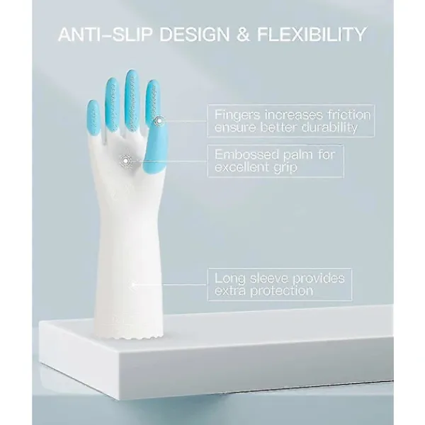 Premium Material PVC diskhandskar är latexfria, DEHP-fria, bly- och kadmiumfria och kan återanvändas och låta dina händer skyddas på jobbet. Halkfri Design: köksträdgårdshandskar design av granulat i handflatan och fingrarna ökar friktionen för att säkerställa ett bättre grepp och kontroll. Hållbara; Bekväma: Extra förstärkning i fingret med blå PVC, säkerställer att diskhandskarna är hållbara på jobbet. Handskarnas längd: rengöringshandsken har lång ärm (32 cm) för vattentäthet, halkskydd och flexibilitet, ger en effektiv barriär för att skydda handleder och underarmar från fukt och vissa frätande vätskor. Används i stor utsträckning: Idealisk för rengöring av kök, badrum och toalett, trädgårdsarbete, klädtvätt, husdjursvård, tvätt av din bil, hantering av disk och andra hushållssysslor och mer. Leveranskvantitet: 1 par Produktfärg: blå