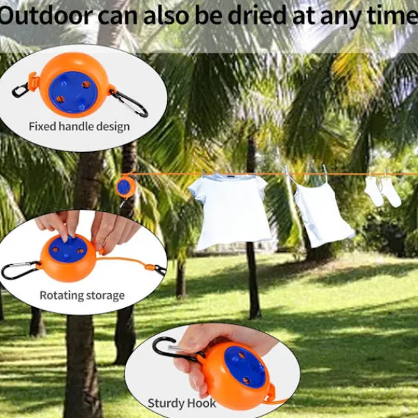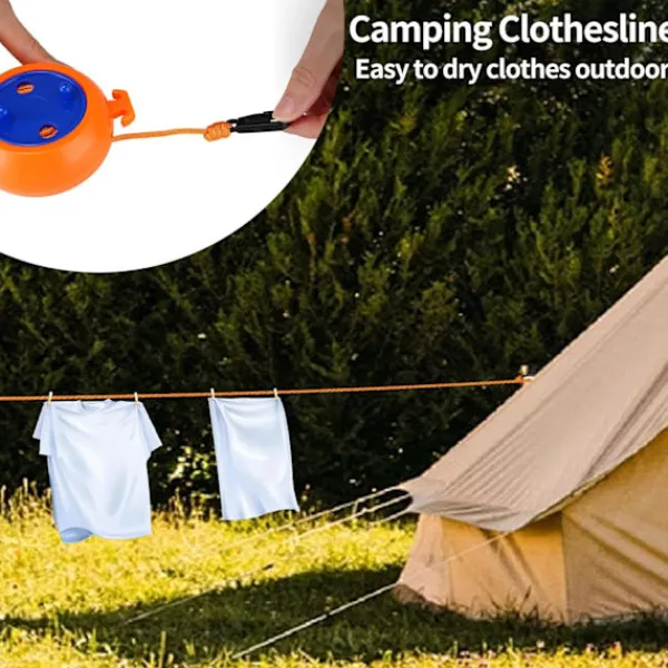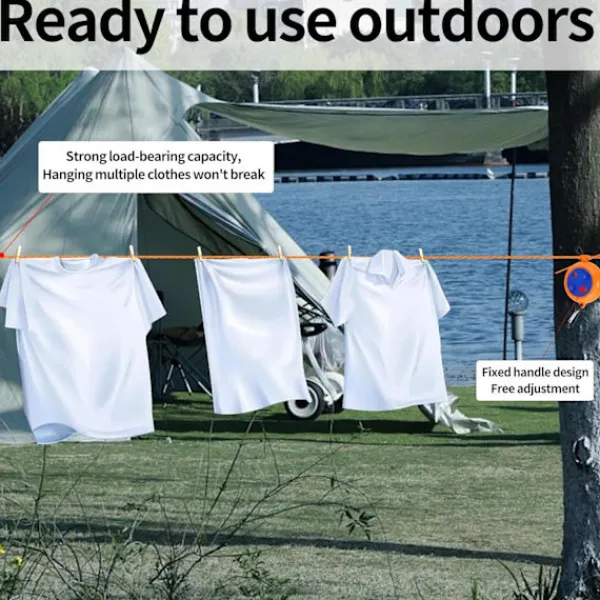 Justerbar längd – töjbar tvättlina, mycket hållbar och robust. Den maximala längden är 10 meter, lämplig för camping, vandring, utomhusaktiviteter etc.