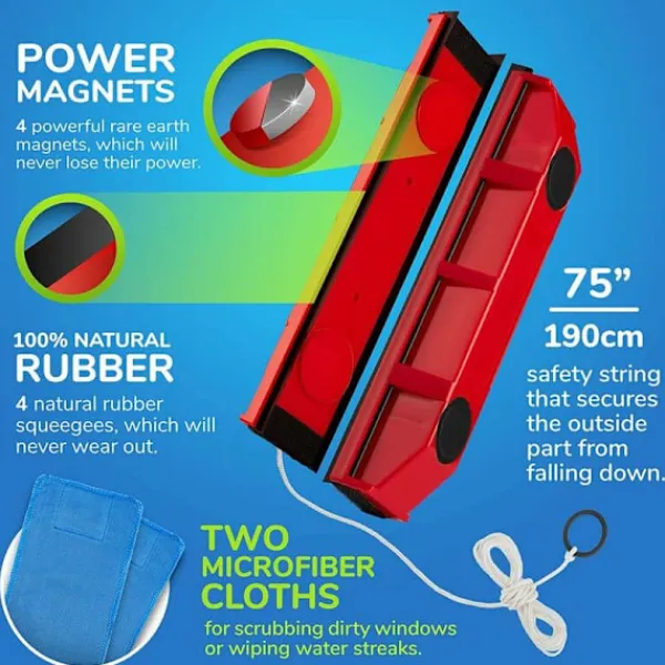 Storlek: 2 – 8 mmUtmärkta rengöringsegenskaper med dubbel funktion: torka och torka i ett svep.Den enda fönsterputsaren med 4 extraktorer – två på varje sida.Lätta och starka sällsynta magneter. Rengör fönster upp till 20 mm tjocka. Levereras med en mikrofiberduk för att ta bort envisa fläckar och polera. Rengör båda sidor samtidigt. Lätt att rengöra. Applicering: Spraya din rengöringslösning på båda sidor av fönstret. Håll den större delen av glidaren åt sidan. inuti fönstret medan du lägger den andra delen åt sidan. utanför. Starka magneter håller de två delarna ihop. pålitligt genom fönsterglaset. Sänk glidaren uppifrån och ned; horisontellt på fönstret på andra sidan. När du kommer till andra sidan kan du vända glidaren upp och ner. Upprepa processen så länge som möjligt tills du är längst ner på fönstret. Rengör För kraftigt nedsmutsade fönster, torka först av ytan med den medföljande mikrofiberduken för att ta bort överflödig smuts. .