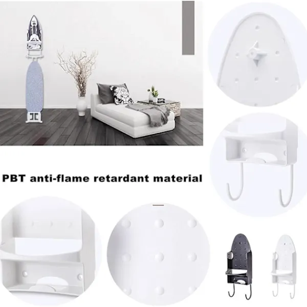 Högkvalitativt materialStrykjärnsbrädestället använder hållbart PBT flamskyddsmedel, BPA-fritt och värmebeständigt upp till 150 grader. Den kan användas för att hänga strykbrädor eller olika småsaker. Stödet strykbrädan är robust, inte lätt att bryta och bleknar inte.