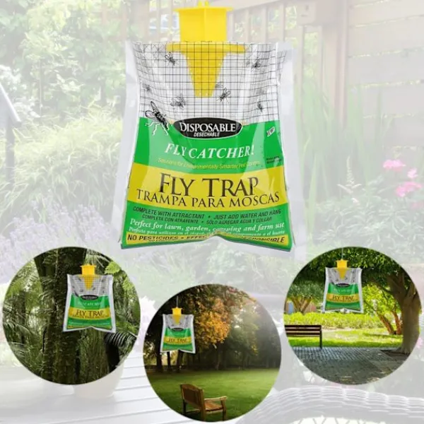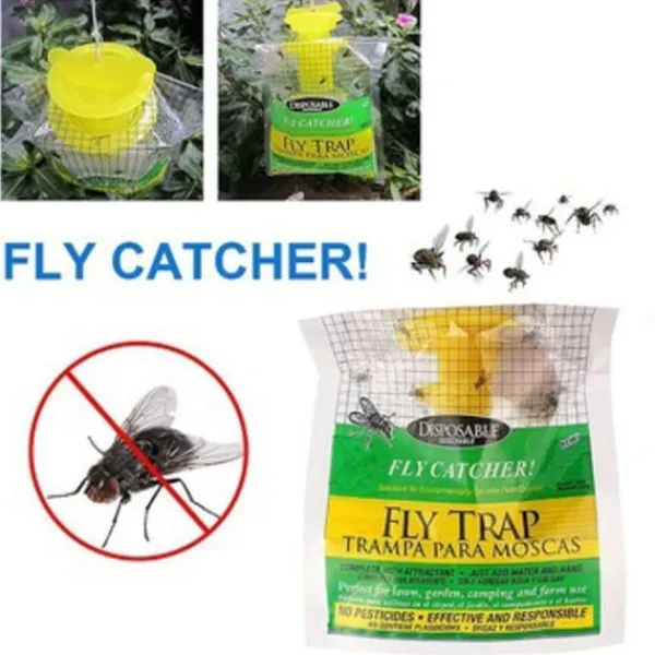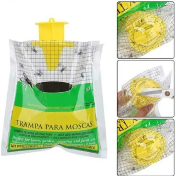 Flugfällor, som läggs i en dragpåse som flyger inte kan motstå. Betepåsen innehåller bete framkallat från något foder etc. När engångsflugpåsen är fylld med vatten börjar betet lösas upp, reagera och förånga en lukt som flugorna flyger in genom det gula locket och drunknar i vattnet.