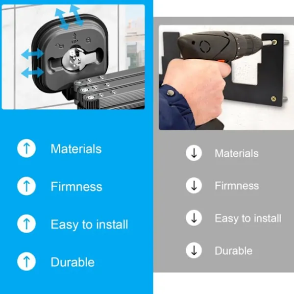【Kraftfull sugkopp】 Denna tvätttork är speciellt utformad med en stark sugkopp för att installeras, vilket gör den enkel att installera och avinstallera. Du behöver inte göra hål i väggen för att installera den. Stödet kan användas på släta väggar; interiört och exteriört.