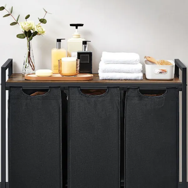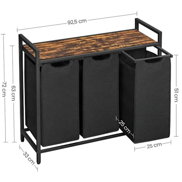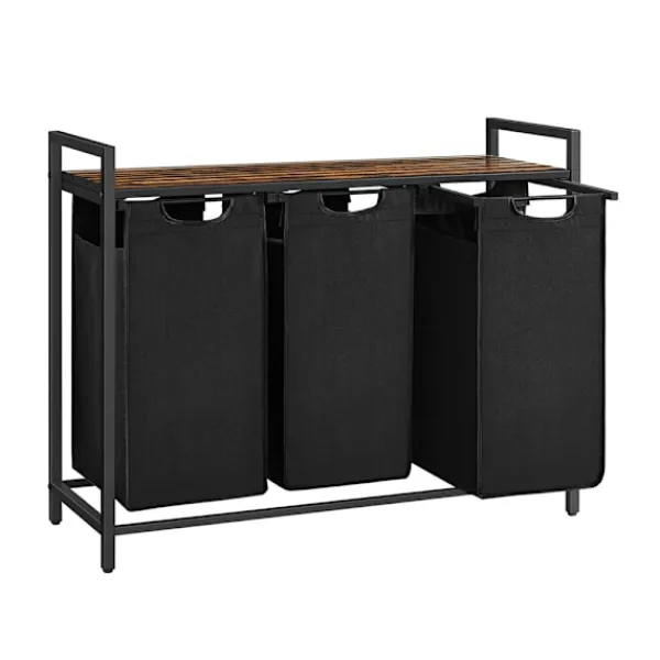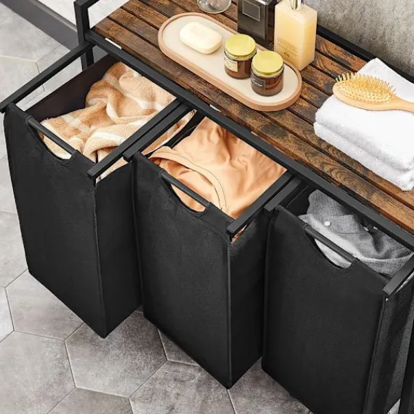 Denna tvättkorgen från VASAGLE kombinerar praktisk funktion med stilren design. Med tre avtagbara påsar på 40 liter vardera kan du enkelt separera ljus och mörk tvätt eller sortera efter material. Den svarta stålramen tillsammans med hyllan i rustik brun finish gör att möbeln passar lika bra i tvättstugan som i badrummet eller sovrummet.