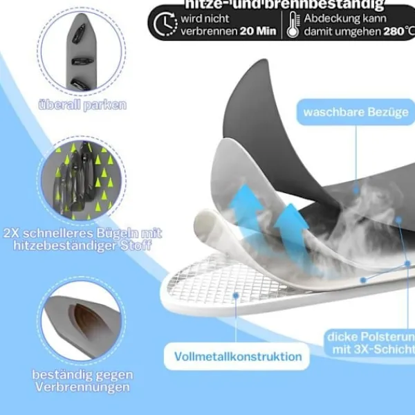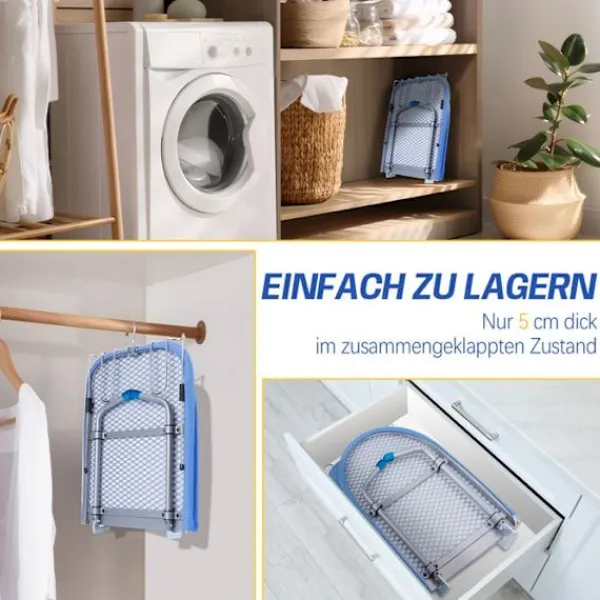 Strykbrädan är utrustad med en glidande strykjärnsställning för enkel åtkomst och en inbyggd hänge för vägg- eller dörrmontering – perfekt för kompakt förvaring.