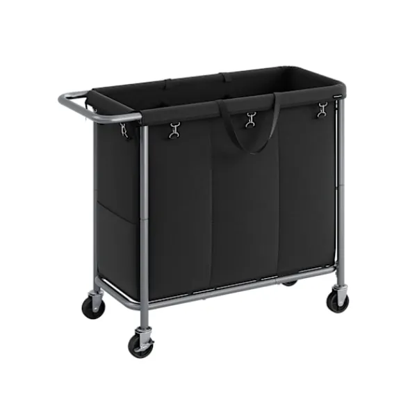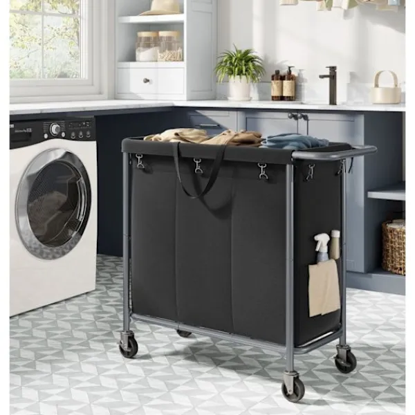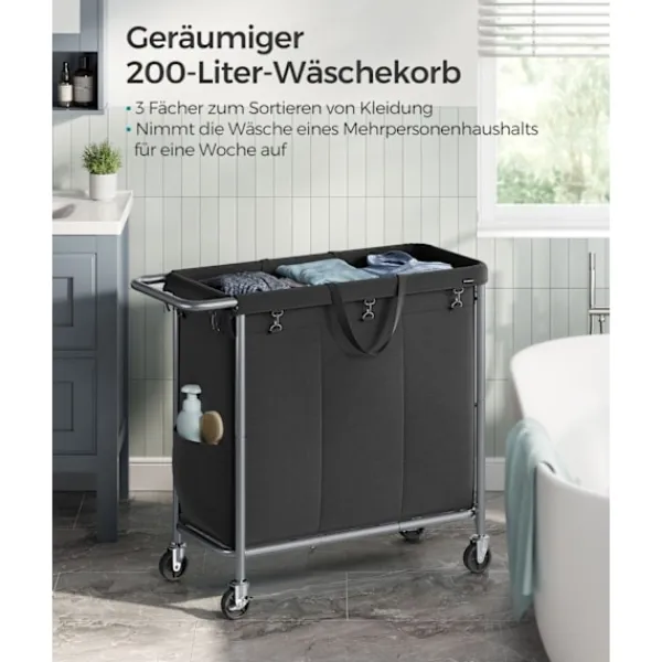 Denna tvättkorg med en kapacitet på 200 liter har tre fack, hjul och ett handtag för enkel transport.