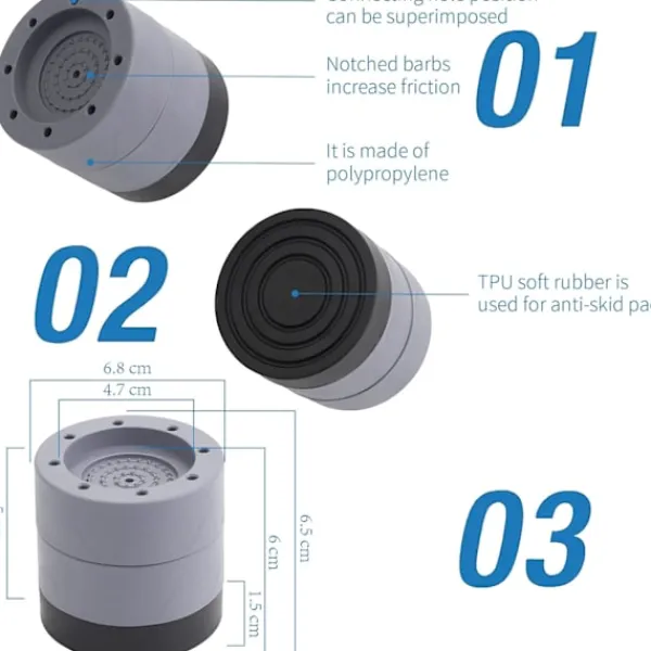 Dimensioner: 4 st tvättmaskinsfötter, apparatfötter upp till 6 cm diameter, 1,5 + 5 cm höjd (den största höjden ökad med ca 5,5 cm), lämplig för de flesta märken av tvättmaskiner och stora apparater.