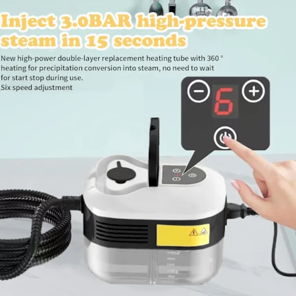 6-Stegs Justerbar Touchknapp: Denna högtrycksångtvätt är utrustad med en 6-stegs justerbar smart pekskärm för att enkelt kontrollera ångutsläppet. Tryck bara på ”+” eller ”-” knappen för att enkelt anpassa ångintensiteten för att möta dina rengöringsbehov.
