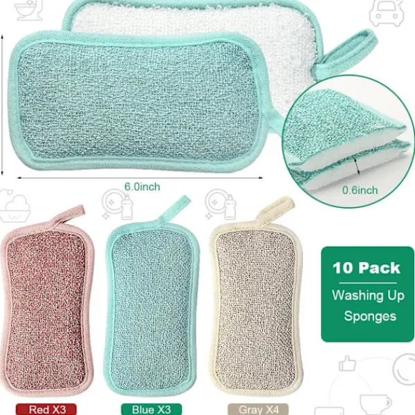Setet innehåller 10 kökssvampar: 3 röda, 3 blå och 4 grå. Den böjda designen på rengöringssvampen är lätt att greppa, med olika friktion på båda sidor. Svampen är vakuumförpackad och återgår till sin ursprungliga form i vatten inom en timme.