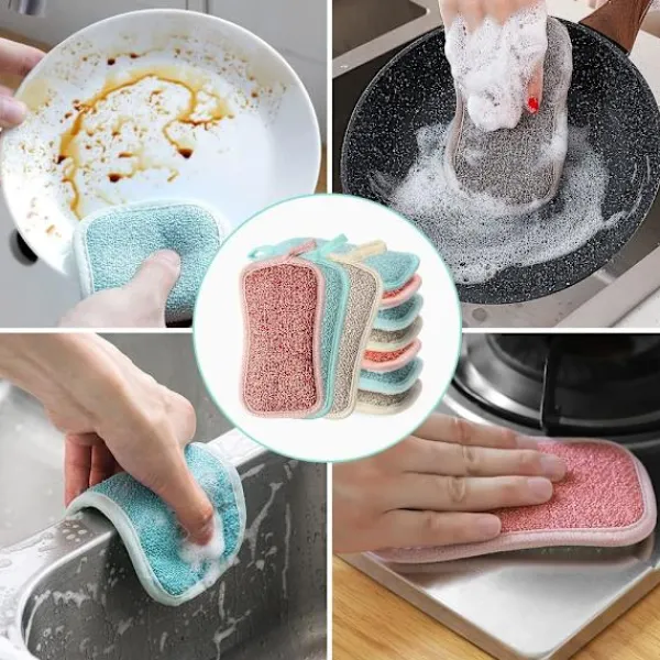 Mångsidig och hållbar tvättbar svamp – ena sidan är mikrofiber för rengöring och avtorkning, den andra sidan är skrubbande icke-slipande för att ta bort klibbiga matrester och envis smuts, perfekt för reptåliga köksredskap.