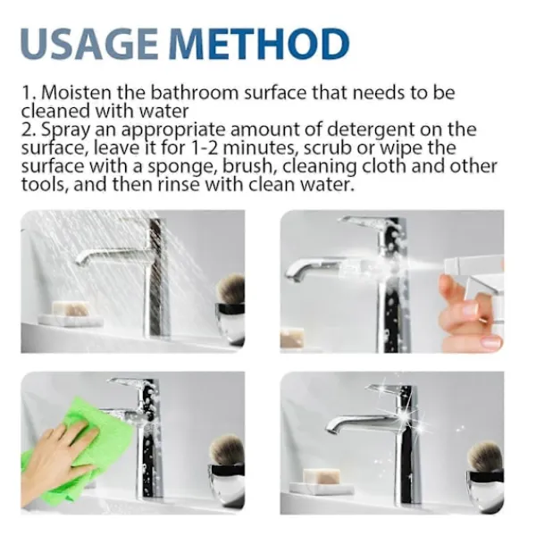 Vår badrumsrengöring innehåller växtextrakt, citronextrakt. Den kan täcka stora ytor med minimalt rengöringsmedel, effektivt och bekvämt, och lämnar din rena yta skinande igen. Användningsmetoden är mycket enkel: fukta badrumsytan som behöver rengöras med vatten, spraya en lämplig mängd rengöringsmedel på ytan, låt det verka i 1-2 minuter, skrubba eller torka ytan med en svamp, borste, rengöringsduk och andra verktyg, och skölj sedan av med vatten. Och kan ta bort fläckar och smuts.