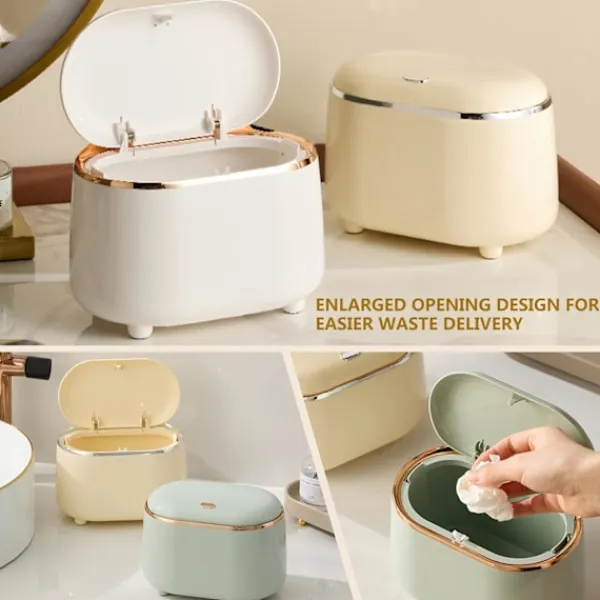 Lätt att använda: Mini papperskorg badrum använder en knapptryckning för att öppna och stänga, vilket gör papperskorgen mer bekväm att öppna, mycket lätt att använda och stänga; tätningseffekten är också mycket bra, om du har kastat bort sopor med dålig lukt, täck bara locket, den utmärkta tätningen kommer att vara mycket bra för att isolera den dåliga lukten, och ge dig en frisk luftmiljö, mer bekvämt och mer hygieniskt.