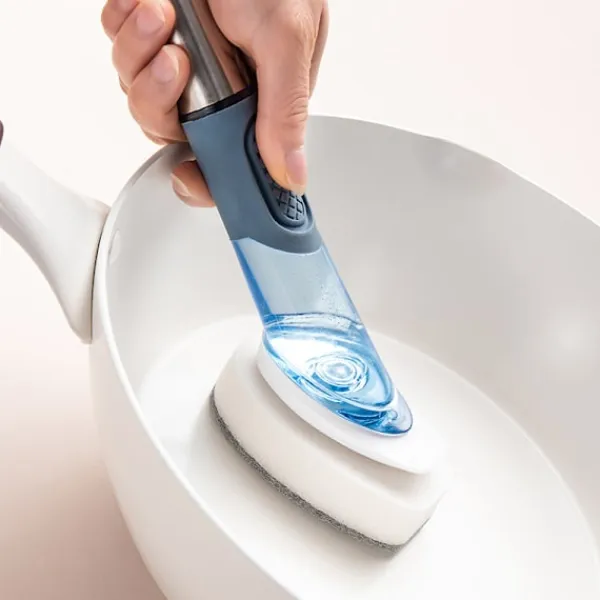 Diskborste med tvålbehållare – När du vill använda den här borsten behöver du bara försiktigt vrida öppningen ovanpå borsten för att tillsätta diskmedel och sedan försiktigt trycka på gummiknappen i mitten av handtaget för att frigöra rätt mängd diskmedel, lämplig för alla typer av tvätt. Den solida strukturen förhindrar att diskmedlet läcker ut. Spara mer diskmedel och gör din disk roligare och effektivare.