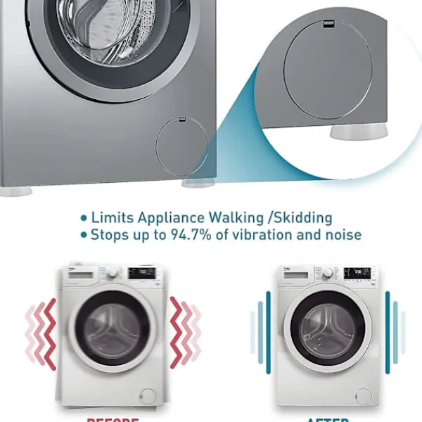 Eliminera vibrationer och buller — Dessa vibrationsdämpande fötter förhindrar att tvättmaskinen hoppar och går, förhindrar att dina maskiner rör sig på golvet och minskar 94,7 % av vibrationer och buller. Stötdämparen passar alla stilar, märken och modeller av tvättmaskiner med front- och toppmatning.