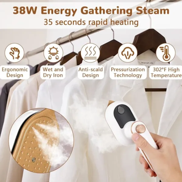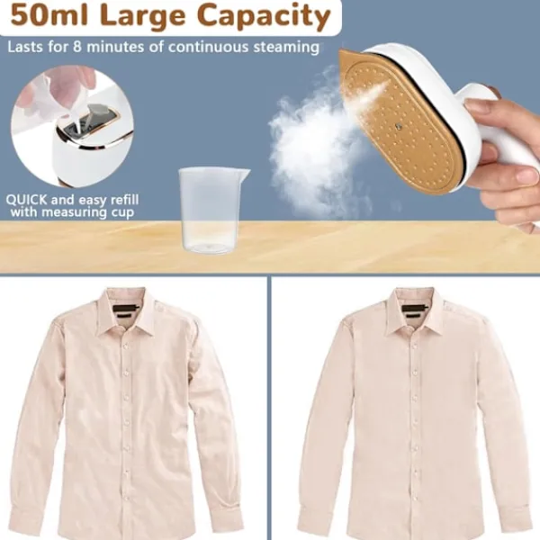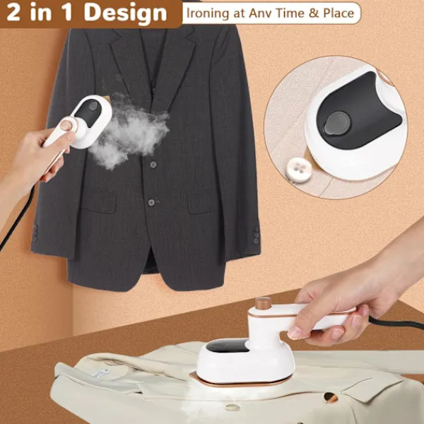Vattentanken är dold och integrerad i strykmaskinen. Före användning, öppna helt enkelt vattentankens lock och fyll vattentanken med en flaska vatten för att undvika stänk. Fukta plagget med en spray och börja stryka. Vi erbjuder även värmedynor. Efter användning kan du placera strykjärnet på värmedynan. 2-i-1 Design: Handhållen klädångare med 2-i-1 design för våt- och torrstrykning. Strykning inom 30 sekunder efter att maskinen slagits på för torrstrykning. Efter påslagning, tryck på vattensprayknappen för att spraya vatten, starta sedan våtstrykning.