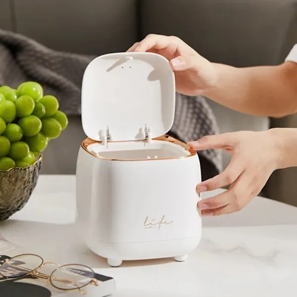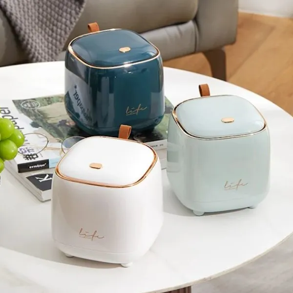 Namn: Lätt lyxig skrivbords papperskorg Material: ABS+mikrofiber Produktstorlek 14,5 x 14,5 x 15 cm