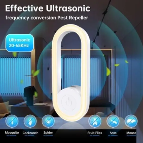 【2 arbetslägen och enkel att använda】 Sätt in musskrämmaren i eluttaget. Första klicket: ultraljudsenheten och nattlampan aktiveras. Andra klicket: stäng endast av nattlampan, ultraljudsmyggskrämmaren fortsätter att fungera. Tredje klicket: Stäng av maskinen. Mini-storlek design. Du kan se skadedjuren försvinna inom 2 till 6 veckor.
