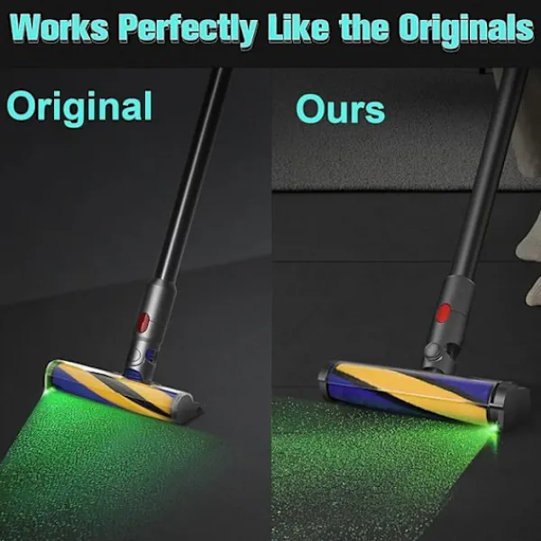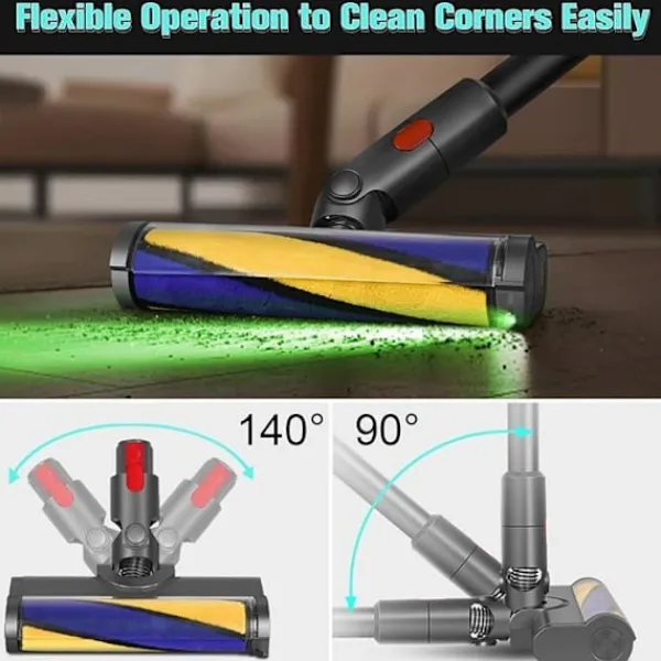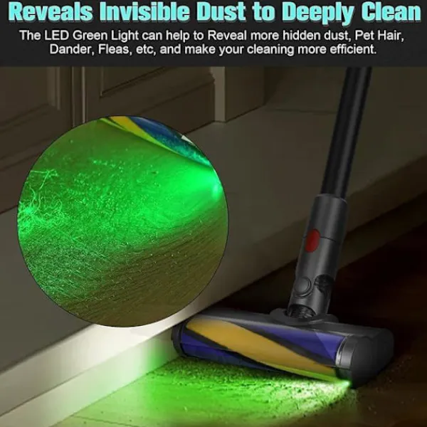 Gröna LED-lampor: Borstvals för Dyson har gröna LED-lampor som kan hjälpa till att känna igen damm och göra städningen effektiv. Idealisk för mörka hörn som under sängen, soffan osv. Flexibelt Borsthuvud: Den elektriska borstvalsens rulle möjliggör en svängning på 140 grader åt vänster och höger och en rotation på 90 grader för att stå upp och torka mer enkelt.